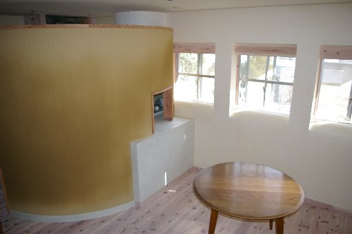 2階リビング。壁面のRが日光を柔らかく感じさせます。左官工事も素晴しいですね。 |