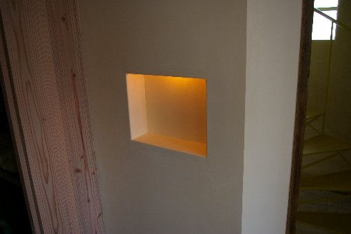 リビングの隅に面白い飾り棚を発見しました。灯りの色合いが和みますね。 |