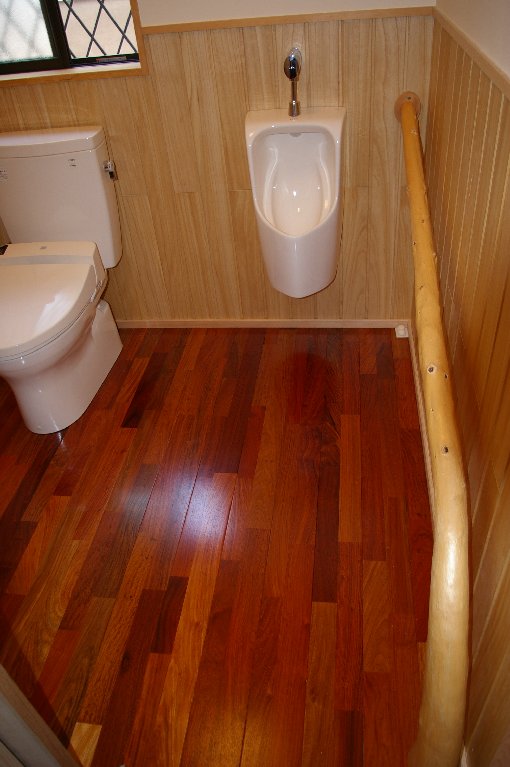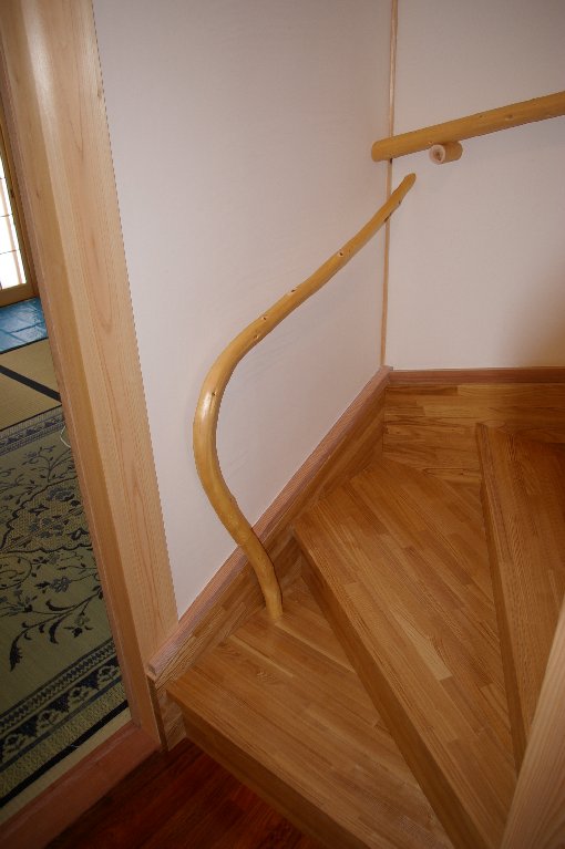 | 階段の手すりは京都北山杉の変木を使っています。ちょっとした遊び心ですね。 | トイレにも変木の手すりが・・・こちらは少し大きめで、もたれ掛かっても大丈夫でした。 |