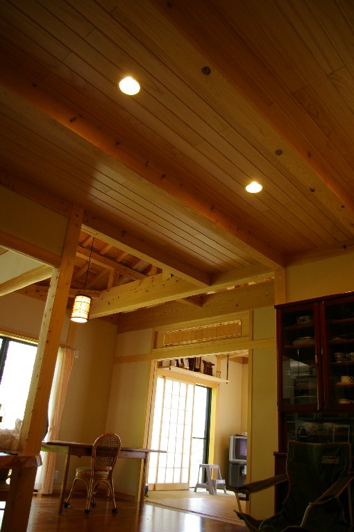 | 構造材は全て国産の杉・檜を使用し、プレカットと伝統工法を駆使して組まれました。 | 居間は天井を付けず、小屋組みを現す事により大空間をつくる事ができました。 |