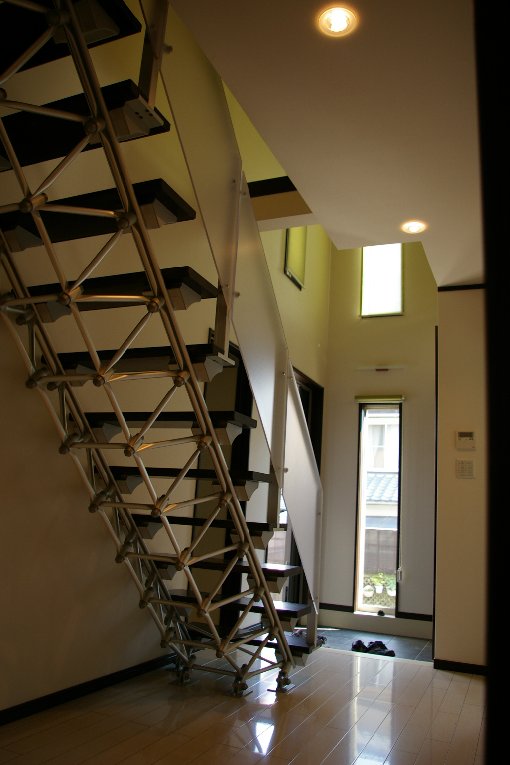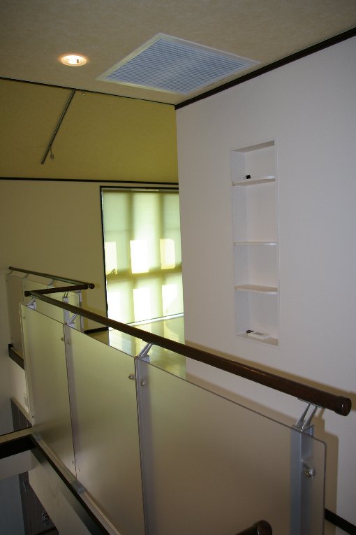 | 玄関入ってまず階段に目を奪われます。ホールは吹き抜けになっています。 | 2階通路。広大な吹き抜けもシッカリした手スリのお陰で安心ですね。 |